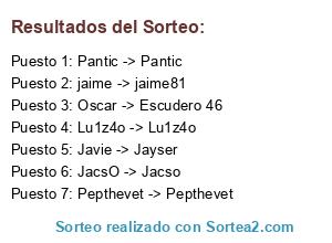Lista de participantes: Lu1z4o -> Lu1z4o, Pepthevet -> Pepthevet, Oscar -> Escudero 46, Javie -> Jayser, jaime -> jaime81, JacsO -> Jacso, Pantic -> Pantic.