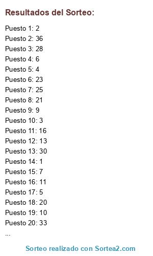 Lista de participantes: 1, 2, 3, 4, 5, 6, 7, 8, 9, 10, 11, 12, 13, 14, 15, 16, 17, 18, 19, 20, 21, 22, 23, 24, 25, 26, 27, 28, 29, 30, 31, 32, 33, 34, 35, 36.