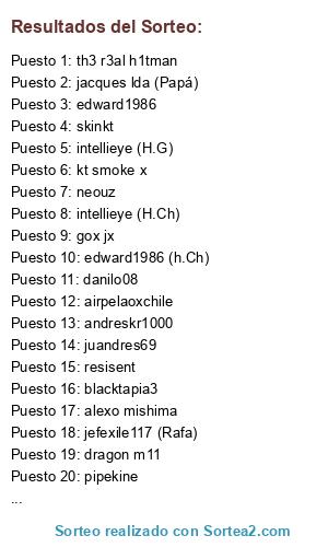 Lista de participantes: huachalomo, neouz, mi kun pst, sirfrank1978.
