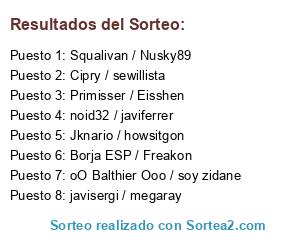 Lista de participantes: Borja ESP / Freakon , Jknario / howsitgon, Primisser / Eisshen, oO Balthier Ooo / soy zidane , noid32 / javiferrer , javisergi / megaray, Squalivan / Nusky89 , Cipry / sewillista.