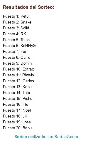 Lista de participantes: Riwels, Tejon, Flu, Noel, Snake, Fer, Solid, Babu, Keos, JK, Picho, Tato, Petu, Domin, Extrax, RK, Curro, Jose, Carlos, KeNNy®.