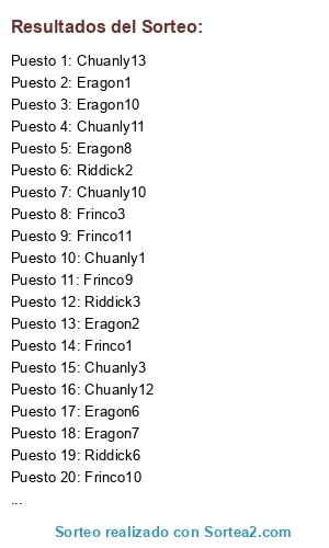 Lista de participantes: Riddick1, Eragon1, Frinco1, Chuanly1, Riddick2, Eragon2, Frinco2, Chuanly2, Riddick3, Eragon3, Frinco3, Chuanly3, Riddick4, Eragon4, Frinco4, Chuanly4, Riddick5, Eragon5, Frinco5, Chuanly5, Riddick6, Eragon6, Frinco6, Chuanly6, Riddick7, Eragon7, Frinco7, Chuanly7, Riddick8, Eragon8, Frinco8, Chuanly8, Riddick9, Eragon9, Frinco9, Chuanly9, Riddick10, Eragon10, Frinco10, Chuanly10, Riddick11, Eragon11, Frinco11, Chuanly11, Riddick12, Eragon12, Frinco12, Chuanly12, Riddick13, Eragon13, Frinco13, Chuanly13.