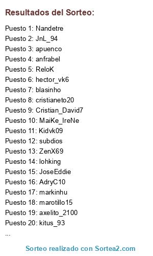 Lista de participantes: AdryC10, anfrabel, apuenco, axelito_2100, bareto87, blasinho, bombermonster, comebicho, cristianeto20, Cristian_David7, cuchurulu, ElCorso, guillem93, hector_vk6, ironawake, JnL_94, JoseEddie, Kidvk09, kitus_93, lohking, MaiKe_IreNe, markinhu, marotillo15, memetchite7, molinathor, Nandetre, Oscarcubero, pmms, prysion, ReloK, spacialfer, subdios, Tecnecio99m, xes__28, xurxofdez, ZenX69.