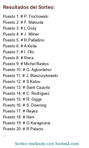 Lista de participantes: # S. Wright-Phillips, # G. Agbonlahor, # T. Walcott, # Santi Cazorla, # L. Valencia, # J. Milner, # R.Palladino, # L.Giuly, # J. Blaszczykowski, # A. Young, # R. Van Persie, # R. Giggs, # Vicente, # Robinho, # Reyes, # P. Trochowski, # Riera, # F. Malouda, # Guardado, # Nani, # I. Olic, # C. Rodriguez, # Michel Bastos, # S. Downing, # S.Kalou, # G.Karagounis, # S.Govou, # A.Keita, # R.Palacio, # A. Lennon.