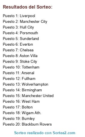 Lista de participantes: Arsenal, Aston Villa, Birmingham, Blackburn Rovers, Bolton, Burnley, Chelsea, Everton, Fullham, Hull City, Liverpool, Manchester City, Manchester United, Porsmouth, Stoke City, Sunderland, Tottenham, West Ham, Wigam Ath., Wolverhampton.