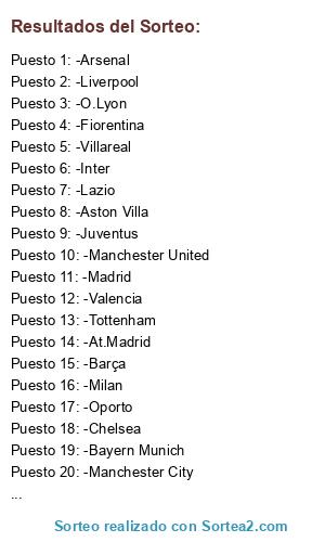 Lista de participantes: -Barça , -Madrid , -Valencia, -At.Madrid , -Sevilla , -Villareal , -Inter , -Juventus , -Milan , -Roma , -Fiorentina , -Lazio , -Manchester United, -Manchester City , -Chelsea, -Arsenal , -Liverpool, -Aston Villa , -Tottenham, -Bayern Munich, -O.Lyon, -O.Marselle, -Girondins de Burdeos , -Oporto.