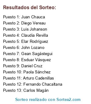 Lista de participantes: Luis Johanson, Claudia Revilla, Esduar Vásquez, Fernando Chacaltana, Gean Sagástegui, Elar Rodríguez, Diego Vereau, Juan Chauca, Paola Sánchez, Daniel Cruz, John Lozano, Carlos Magán, Arturo Cadenillas.