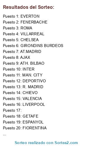 Lista de participantes: AT.MADRID, GETAFE, ESPANYOL, R. MADRID, DEPORTIVO, BARCELONA, SEVILLA, VILLARREAL, ASTON VILLA, ARSENAL, MAN. CITY, STOKE CITY, TOTTENHAM, MAN. UTD, LIVERPOOL, CHELSEA, JUVENTUS, FIORENTINA, A.C. MILAN, INTER, PARMA, PALERMO, CHIEVO, ROMA, PSG, AJAX, FENERBACHE, OLYMPIAKOS, CELTIC GLASGOW, BOCA JUNIORS, OLYM. MARSELLA, ZENIT, VALENCIA, MALLORCA, ATH. BILBAO, EVERTON, FULHAM, SUNDERLAND, GENOVA, ATALANTA, OLYM. LYONNAIS, GIRONDINS BURDEOS, .