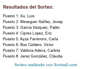 Lista de participantes: Ayza Farrerons, Carla, Bos Caldero, Victor, Cipres Lopez, Eric, Garcia Vazquez, Pablo, Jerez González, Clàudia, Meseguer Ibáñez, Josep, Valdivia Adeva, Carlota, Xu, Luis.