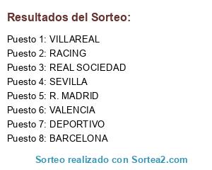 Lista de participantes: R. MADRID, SEVILLA, VILLAREAL, DEPORTIVO, RACING, VALENCIA, REAL SOCIEDAD, BARCELONA.