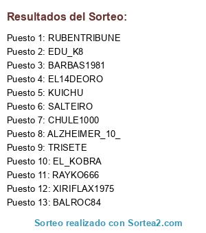 Lista de participantes: TRISETE, RUBENTRIBUNE, EL_KOBRA, BARBAS1981, XIRIFLAX1975, EL14DEORO, BALROC84, KUICHU, CHULE1000, ALZHEIMER_10_, SALTEIRO, EDU_K8, RAYKO666.