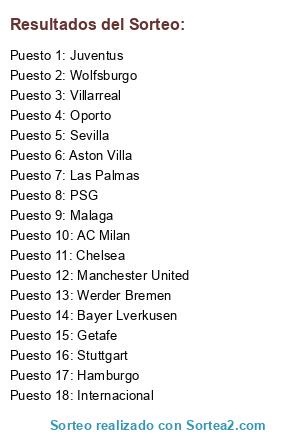 Lista de participantes: Werder Bremen, Hamburgo, Villarreal, Bayer Lverkusen, Stuttgart, Juventus, Wolfsburgo, Internacional, PSG, AC Milan, Oporto, Manchester United, Chelsea, Aston Villa, Las Palmas, Getafe, Sevilla, Malaga.