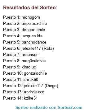 Lista de participantes: kzike31, androlaxxx, mag0valdivia, shr3k60, gonzalochile, jefexile117 (Diego), xirac uc, jefexile117 (Rafa), panchodance, airpelaoxchile, jacques lda, dengon chile, monogorn, arcansor.