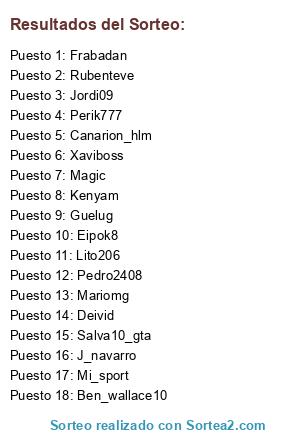 Lista de participantes: Jordi09, Salva10_gta, Mariomg, Magic, J_navarro, Canarion_hlm, Ben_wallace10, Kenyam, Xaviboss, Eipok8, Rubenteve, Deivid, Mi_sport, Lito206, Guelug, Pedro2408, Perik777, Frabadan.