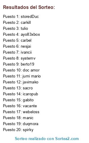 Lista de participantes: sacro, gabito, ivancii, spirky, berto19, jumi mario, storedDuc, ayo83xbox, carkill, duqmora, nesjai, manic, systemv, javimako, tulio, icaropub, webeloss, doc amor, carbel, vacante.
