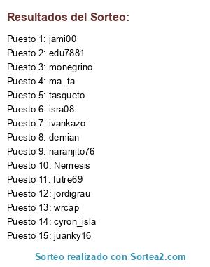 Lista de participantes: Nemesis, cyron_isla, isra08, monegrino, ivankazo, futre69, jordigrau, tasqueto, naranjito76, demian, jami00, edu7881, wrcap, ma_ta, juanky16.