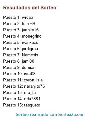 Lista de participantes: Nemesis, cyron_isla, isra08, monegrino, ivankazo, futre69, jordigrau, tasqueto, naranjito76, demian, jami00, edu7881, wrcap, ma_ta, juanky16.