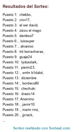 Lista de participantes: redoxo07, , julibox,, danibox7, , xmhr b1dalot,, chekbo,, crivi17,, tnt borracheras,, guaje24, , javinr10, , zlato z,, tydusdark,, el ser david,, zizou el mago, , alvarosc, chechuki, , jjcrack,, diciembre, , alead71, , luissuper, , bordeco80, , marin rmz, , pierini23, , drasic14, Anonimo.