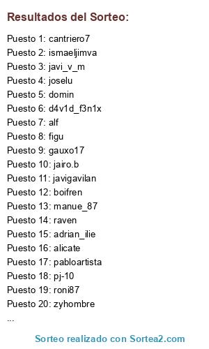 Lista de participantes: d4v1d_f3n1x, joselu, kamikace, javigavilan, ismaeljimva, jairo.b, zyhombre, boifren, zequi, domin, josemayeah, pabloartista, figu, vidal, rafana, gauxo17, raven, adrian_ilie, roni87, alf, lolazo, alicate, Lakored, pj-10, kikobelmonte, daxman09, cantriero7, Oseiyo, DaNyEr, javi_v_m, troyanazo, manue_87.