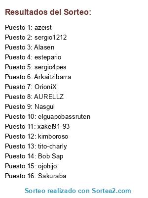 Lista de participantes: sergio4pes , OrioniX , ojohijo , Alasen , elguapobassruten , Nasgul , AURELLZ , Arkaitzibarra , azeist , tito-charly , Sakuraba , estepario , Bob Sap , kimboroso , xakel91-93 , sergio1212.