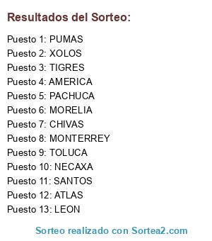 Lista de participantes: AMERICA, ATLAS, CHIVAS, LEON, MONTERREY, MORELIA, NECAXA, PACHUCA, PUMAS, SANTOS, TIGRES, TOLUCA, XOLOS.