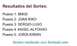 Lista de participantes: ANGEL-ALFONSO, JOAN-KIKO, JORDI-KIRIAN, MIKIS, SERGIO-LUXO.