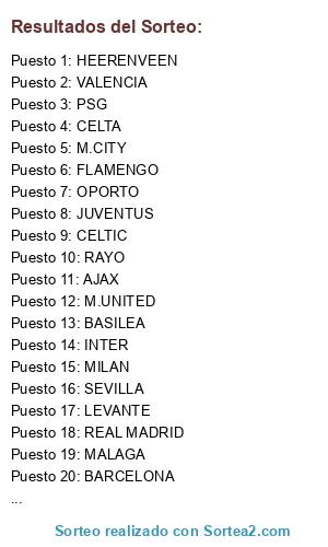 Lista de participantes: CELTA, CELTIC, SEVILLA, VALENCIA, JUVENTUS, RAYO, MILAN, MALAGA, OPORTO, HEERENVEEN, OSASUNA, BASILEA, M.UNITED, ESPANYOL, REAL MADRID, AJAX, BARCELONA, ATLETICO, M.CITY, PSG, LEVANTE, FLAMENGO, BAYERN, INTER.