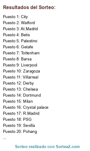 Lista de participantes: Paranaense, Getafe, PSG, Palestino, R.Madrid, Milan, Valencia, Zaragoza, Napoles, Chelsea, Betis, Celta, Arsenal, Tottenham, Las Palmas, City, Barsa, Leipzig, Ajax, Racing, Sevilla, At.Madrid, Liverpool, Dortmund, Watford, Athletic, Pohang, Derby, Fulham, Albacete, Crystal palace, Villarreal.