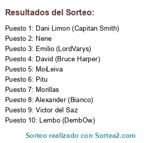 Lista de participantes: Dani Limon (Capitan Smith), David (Bruce Harper), Pitu, Alexander (Bianco), Morillas, Nene, Lembo (DembOw), MoiLeiva, Victor del Saz, Emilio (LordVarys).