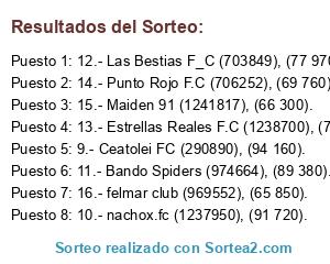Lista de participantes: 9.- Ceatolei FC (290890), (94 160)., 10.- nachox.fc (1237950), (91 720)., 11.- Bando Spiders (974664), (89 380)., 12.- Las Bestias F_C (703849), (77 970)., 13.- Estrellas Reales F.C (1238700), (75 440)., 14.- Punto Rojo F.C (706252), (69 760)., 15.- Maiden 91 (1241817), (66 300)., 16.- felmar club (969552), (65 850)..