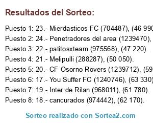Lista de participantes: 17.- You Suffer FC (1240746), (63 330)., 18.- cancurados (974442), (62 170)., 19.- Inter de Rilan (968011), (61 780)., 20.- CF Osorno Rovers (1239712), (59 940)., 21.- Melipulli (288287), (50 050)., 22.- patitosxteam (975568), (47 220)., 23.- Mierdasticos FC (704487), (46 990)., 24.- Penetradores del area (1239470), (45 790)..