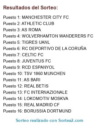 Lista de participantes: RCD ESPANYOL, JUVENTUS FC, RC DEPORTIVO DE LA CORUÑA, AS ROMA, REAL BETIS, LOKOMOTIV MOSKVA, MANCHESTER CITY FC, WOLVERHAMTON WANDERERS FC, CELTIC FC, TIGRES UANL, ATHLETIC CLUB, REAL MADRID CF, AS BARI, TSV 1860 MUNCHEN, BORUSSIA DORTMUND, FC INTERNAZIONALE.