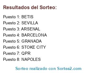 Lista de participantes: QPR, STOKE CITY, GRANADA, NAPOLES, SEVILLA, BETIS, BARCELONA, ARSENAL.