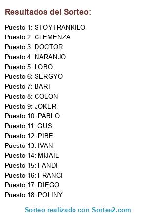 Lista de participantes: PIBE, STOYTRANKILO, DOCTOR, LOBO, DIEGO, NARANJO, JOKER, GUS, PABLO, POLINY, MIJAIL, COLON, BARI, IVAN, FANDI, FRANCI, SERGYO, CLEMENZA.