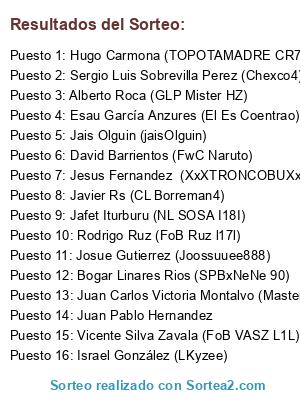 Lista de participantes: Vicente Silva Zavala (FoB VASZ L1L), Bogar Linares Rios (SPBxNeNe 90), Javier Rs (CL Borreman4), Jafet Iturburu (NL SOSA I18I), Esau García Anzures (El Es Coentrao), David Barrientos (FwC Naruto), Rodrigo Ruz (FoB Ruz l17l), Hugo Carmona (TOPOTAMADRE CR7), Sergio Luis Sobrevilla Perez (Chexco4), Jais Olguin (jaisOlguin), Israel González (LKyzee), Juan Pablo Hernandez, Jesus Fernandez (XxXTRONCOBUXxX), Josue Gutierrez (Joossuuee888), Juan Carlos Victoria Montalvo (MasterJeyce), Alberto Roca (GLP Mister HZ).