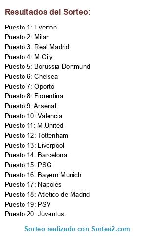 Lista de participantes: Juventus, Valencia, Barcelona, Atletico de Madrid, Liverpool, Borussia Dortmund, PSG, Bayern Munich, Everton, Real Madrid, M.United, PSV, Milan, M.City, Arsenal, Napoles, Oporto, Chelsea, Tottenham, Fiorentina.