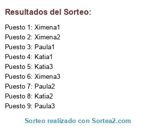Lista de participantes: Ximena1, Paula1, Katia1, Katia2, Paula2, Ximena2, Paula3, Katia3, Ximena3.