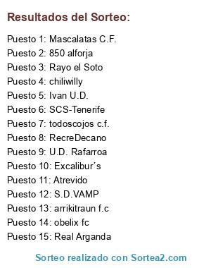 Lista de participantes: Excalibur´s, maestro210, Rayo el Soto, Real Barroso F.C., arrikitraun f.c, U.D. Rafarroa, SCS-Tenerife, chiliwilly, obelix fc, 850 alforja, Dardos, RecreDecano, Real Arganda, S.D.VAMP, Mascalatas C.F., todoscojos c.f., Ivan U.D., Atrevido.