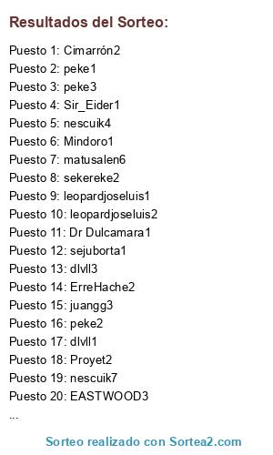 Lista de participantes: Africanus1, Africanus2, antonio61, antonio62, aremor1, arthas_fito1, arthas_fito2, asanti1, asanti2, asanti3, axantemirt-guayota1, axantemirt-guayota2, budy1, budy2, cabello1, cabello2, cabello3, cabello4, carines1, carlosfergar1, carlosfergar2, carlosfergar3, Cimarrón1, Cimarrón2, Cimarrón3, Dantonp1, Darkbit1, Darkbit2, Dr Dulcamara1, Dr Dulcamara2, Dr Dulcamara3, dlvll1, dlvll2, dlvll3, EASTWOOD1, EASTWOOD2, EASTWOOD3, El Druida1, El Druida2, el_doctor1, el_doctor2, el_doctor3, el_doctor4, el_doctor5, eldenegro1, eldenegro2, eldenegro3, ErreHache1, ErreHache2, Fanfloïd1, Fanfloïd2, Filo-filo1, Filo-filo2, Filo-filo3, Foruu1, Foruu2, Hermanito1, Hermanito2, Ipotxa1, Ipotxa2, Irdor1, Irdor2, Irdor3, jarl90001, Jluis1, Jluis2, jol61, jol62, juanmpa1, juangg1, juangg2, juangg3, kero1, leopardjoseluis1, leopardjoseluis2, mahou1, MALVA1, MALVA2, MALVA3, Marcus1, Marcus2, Mastropiero1, Mastropiero2, Mastropiero3, Mastropiero4, Mastropiero5, Mastropiero6, matusalen1, matusalen2, matusalen3, matusalen4, matusalen5, matusalen6, matusalen7, matusalen8, matusalen9, matusalen10, Miltor1, Miltor2, Mindoro1, Mindoro2, Moreno X1, Moreno X2, Moreno X3, Moreno X4, nescuik1, nescuik2, nescuik3, nescuik4, nescuik5, nescuik6, nescuik7, nescuik8, nescuik9, nescuik10, olemrac1, olemrac2, olemrac3, PACO GALAN1, PACO GALAN2, peke1, peke2, peke3, Peter_611, Peter_612, Pohj1, pulidor1, pulidor2, pulidor3, Proyet1, Proyet2, Proyet3, Proyet4, ramonin1, ramonin2, redondear1, redondear2, Richard1, Richard2, Richard3, Richard4, Richard5, Richard6, rowinhod1, rowinhod2, salieri1, salieri2, sejuborta1, sejuborta2, sejuborta3, sekereke1, sekereke2, sekereke3, Sir_Eider1, Sir_Eider2, Tenso1, TIAGO1, TIAGO2, TIAGO3, trasgo1, Trevize1, uragea1, uragea2, VerdaKrajono1, VerdaKrajono2, VIALA1, VIALA2, VIALA3, Vince1, Vince2, wakeup1, wakeup2, waxo1, Wizard1, Wizard2, Wizard3, Zascandil1, zaqueo_331, zaqueo_332, zomprex1, zomprex2, zomprex3, Zoroastro1, Zoroastro2, Zoroastro3, Zoroastro4, zumo1.