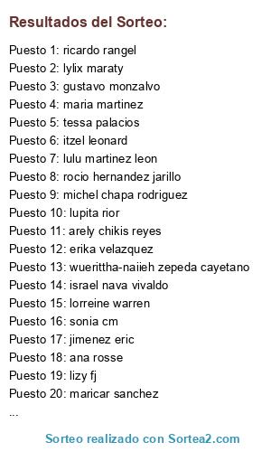 Lista de participantes: marianita martinez , gustavo monzalvo , lulu martinez leon , jimenez eric , lupita rior , maria martinez , karla felix , beto salas , lylix maraty , michel chapa rodriguez , rocio hernandez jarillo , aldo adreani , lizy fj , elias hernandez alvarez , gustavo rull , wuerittha-naiieh zepeda cayetano , ivan alarcón , arely chikis reyes , mila mielisu , annie anma , paulina ibarra rodriguez , maricar sanchez , amanda garcia , eli islas espinosa , mary kar , erika velazquez , oscar resendiz cruz , ana rosse , sonia cm , itzel leonard , israel nava vivaldo , lupita peña , lorreine warren , tessa palacios , ricardo rangel.