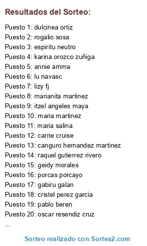 Lista de participantes: oscar resendiz cruz , andy perez martinez , canguro hernandez martinez , arturo salazar , pablo beren , itzel angeles maya , espiritu neutro , gabiru galan , maria salina , rogalio sosa , geidy morales , cristel perez garcia , maria martinez , annie amma , carrie cruise , marianita martinez , dulcinea ortiz , lu navasc , diego antonio , lizy fj , karina orozco zuñiga , porcas porcayo , raquel gutierrez rivero.