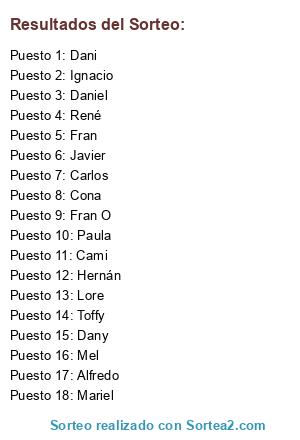 Lista de participantes: René, Cona, Toffy, Alfredo, Ignacio, Daniel, Dani, Paula, Fran, Hernán, Fran O, Cami, Mariel, Lore, Carlos , Javier , Mel, Dany.