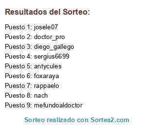 Lista de participantes: diego_gallego, sergius6699, antycules, rappaelo, doctor_pro, mefundoaldoctor, foxaraya, josele07, nach.