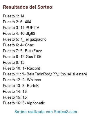 Lista de participantes: 1- Raicoht, 2- Wokooo, 3- Alphonetic, 4- Chac, 5- BuzzFuzz, 6- 404, 7_ el gazpacho, 8- BurfoK, 9- BelaFarinRod¿??¿ (no sé si estaré sobre las 21:30, si llega la hora y no estoy no me tengáis en cuenta), 10-dlg89, 11-PUPITA, 12-Gus1105, 13, 14, 15, 16.