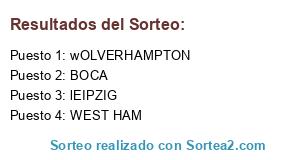 Lista de participantes: wOLVERHAMPTON, lEIPZIG, WEST HAM, BOCA.