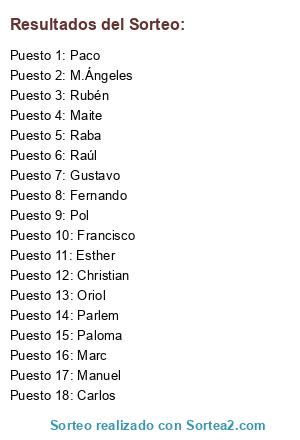 Lista de participantes: Carlos (4), Christian (4), Paco (1), Raba (2), Francisco (10), Marc (3), Fernando (4), Paloma (2), Esther (2), Maite (2), M.Ángeles (6), Rubén (4), Raúl (1), Manuel (3), Parlem (2), Pol (2), Oriol (1), Gustavo (6).