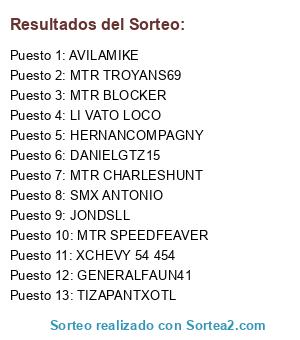 Lista de participantes: SMX ANTONIO(6 participaciones), LI VATO LOCO(3 participaciones), AVILAMIKE(5 participaciones), XCHEVY 54 454(5 participaciones), MTR BLOCKER(5 participaciones), MTR SPEEDFEAVER(5 participaciones), MTR CHARLESHUNT(6 participaciones), HERNANCOMPAGNY(3 participaciones), DANIELGTZ15(4 participaciones), GENERALFAUN41(6 participaciones), JONDSLL(5 participaciones), TIZAPANTXOTL(4 participaciones), MTR TROYANS69(5 participaciones).