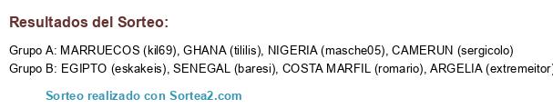 Lista de participantes: CAMERUN (sergicolo), ARGELIA (extremeitor), MARRUECOS (kil69), COSTA MARFIL (romario), SENEGAL (baresi), NIGERIA (masche05), GHANA (tililis), EGIPTO (eskakeis).