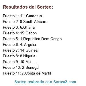 Lista de participantes: 1.Republica Dem Congo, 2.Senegal, 3.Marruecos, 4. Argelia, 5.Tunez, 6.Ghana, 7.Costa de Marfil, 8.Nigeria, 9.South African., 10.Mali -, 11. Camerun, 12.Zimbawe, 13.Burquina Faso, 14.Guinea, 15.Gabon.