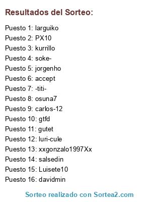 Lista de participantes: gutet, soke-, jorgenho, xxgonzalo1997Xx, larguiko, kurrillo, davidmin, luri-cule, accept, gtfd, PX10, carlos-12, osuna7, salsedin, -titi-, Luisete10.